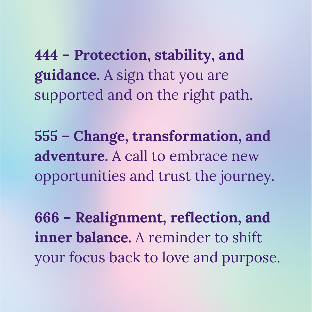 - 666 – Realignment, reflection, and inner balance. A reminder to shift your focus back to love and purpose.