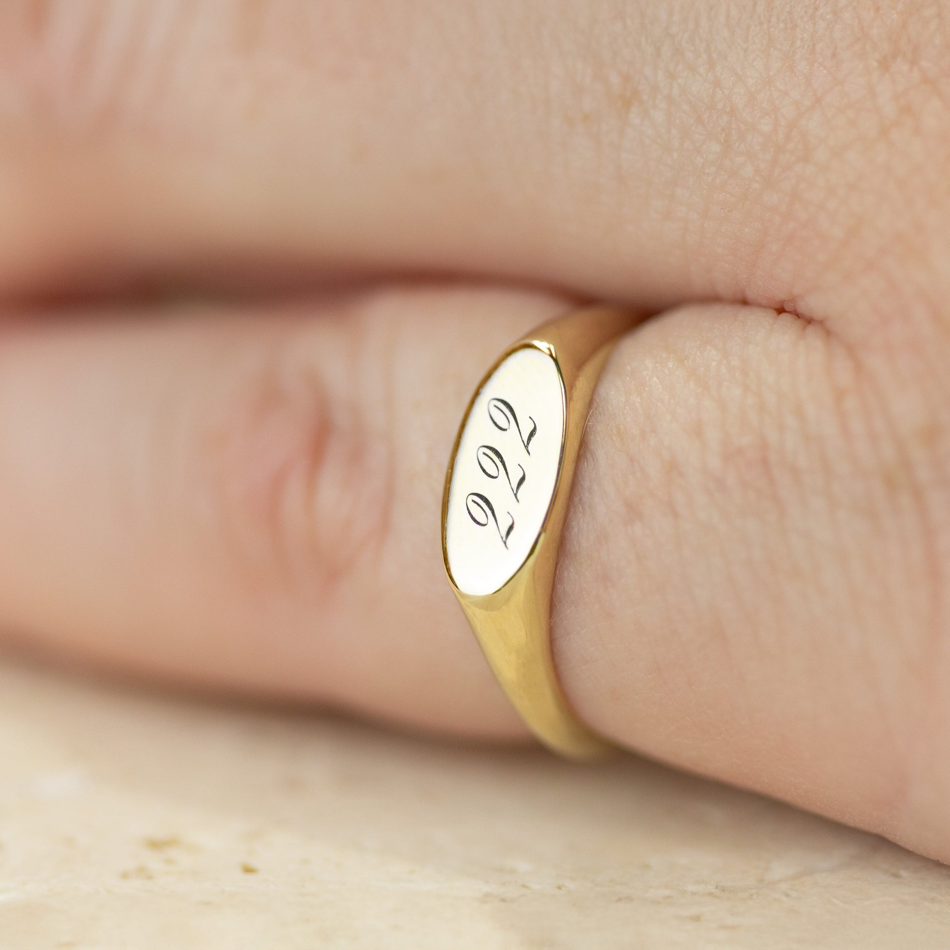 Engraved in elegant cursive, this lightweight signet is adorned with the angel number of your choice — 111, 222, 333, 444, 555, 666, 777, 888, 999, or 11:11 — each carrying its own spiritual significance.