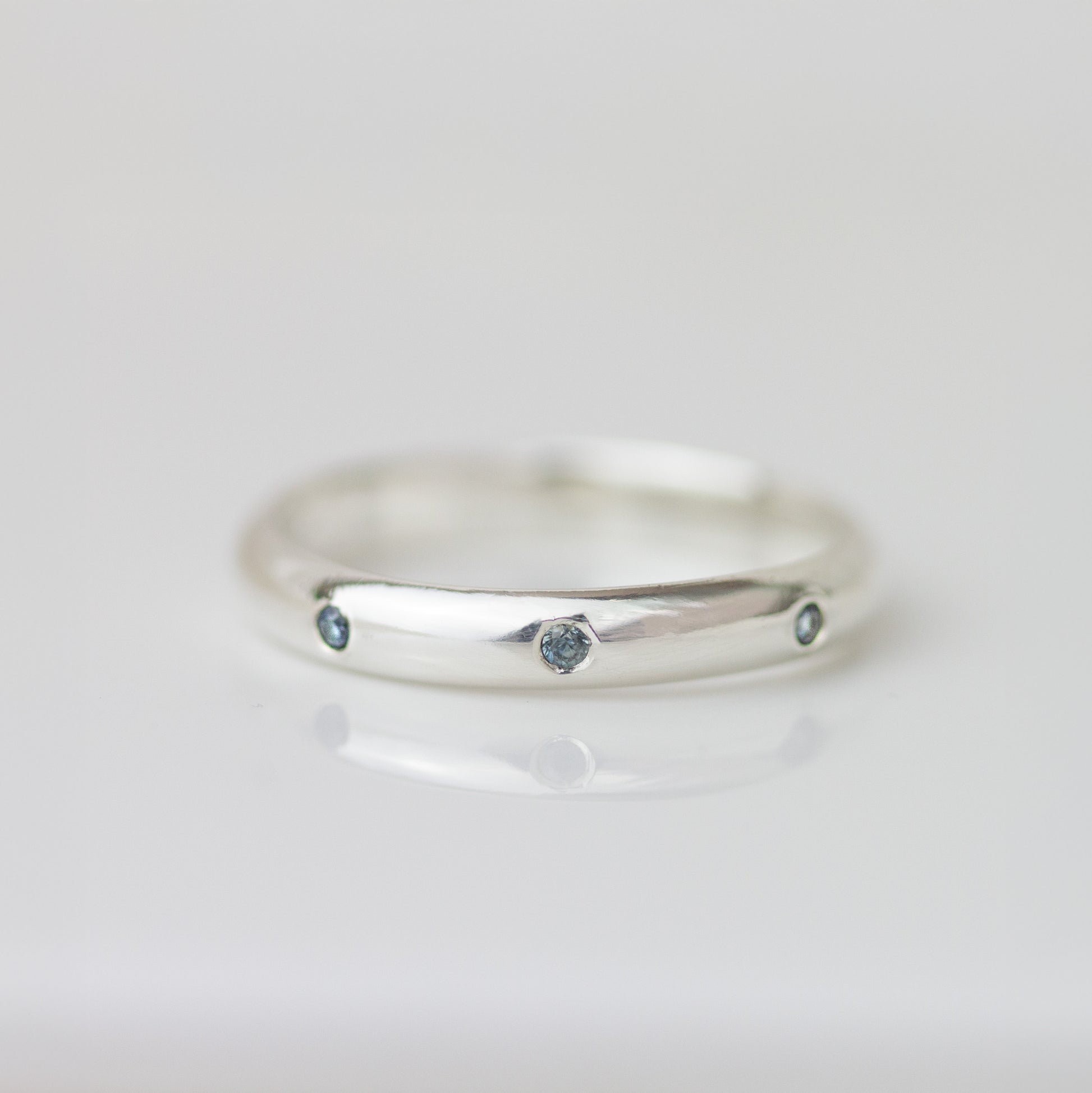 Featuring three flush-set Australian sapphires and a softly curved 3mm half-round band ensures a comfortable fit.
