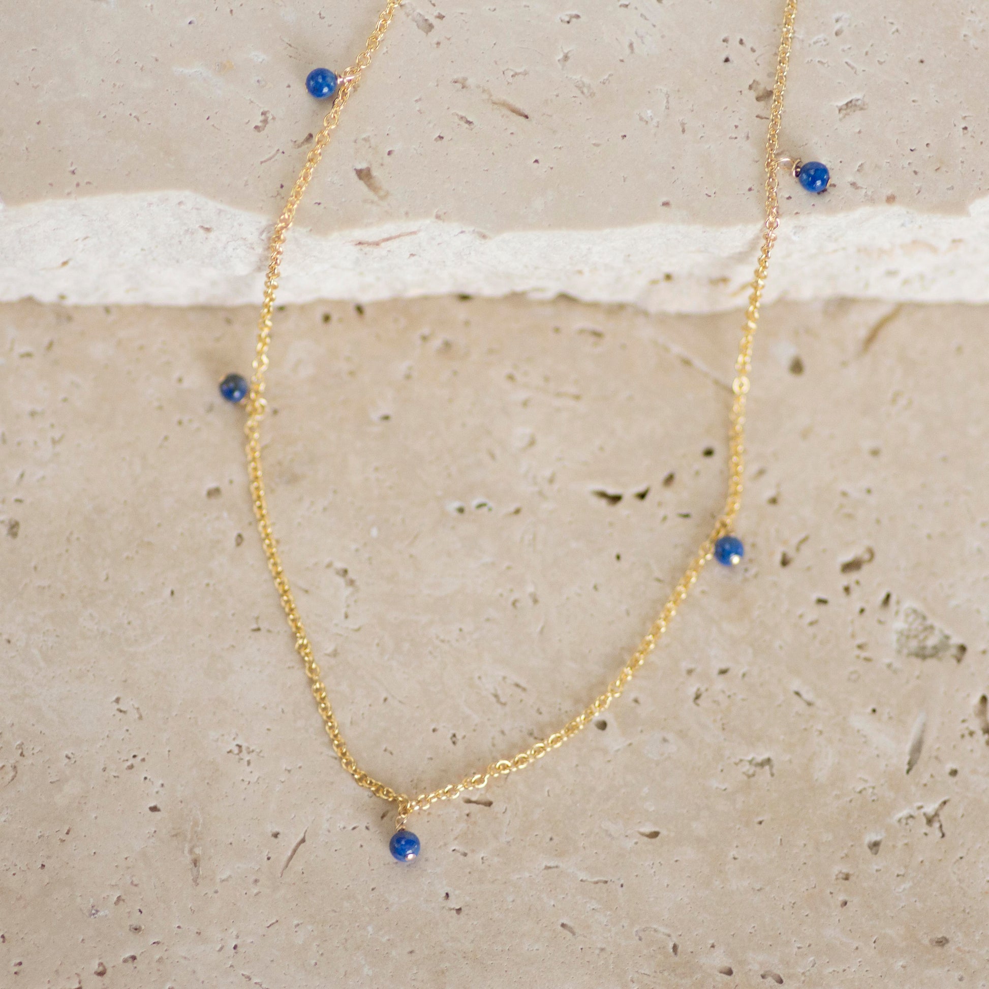 Five small natural lapis stone beads are delicately dotted along the chain, creating a fine statement piece that catches the eye. Perfect for layering with other necklaces, it adds a touch of elegance and "something blue" to any outfit. Elevate every outfit with our Lapis Seed Necklace.